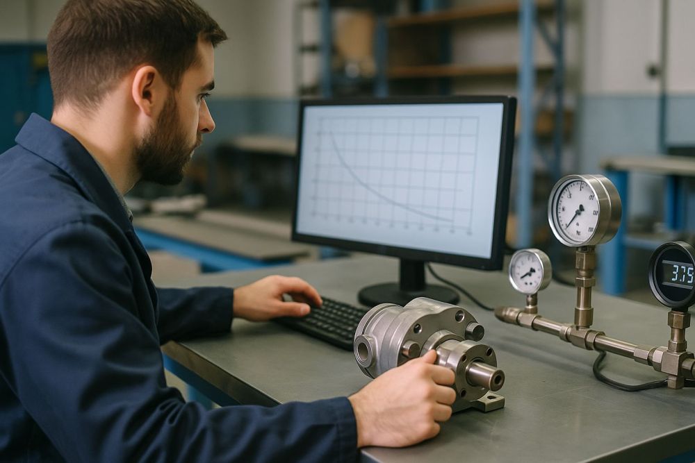 A curva de vazão é o ponto de partida para avaliar o desempenho hidráulico de uma bomba de engrenagem. Ela mostra a capacidade volumétrica do equipamento em diferentes condições operacionais e ajuda a prever o comportamento diante de mudanças de viscosidade ou temperatura.